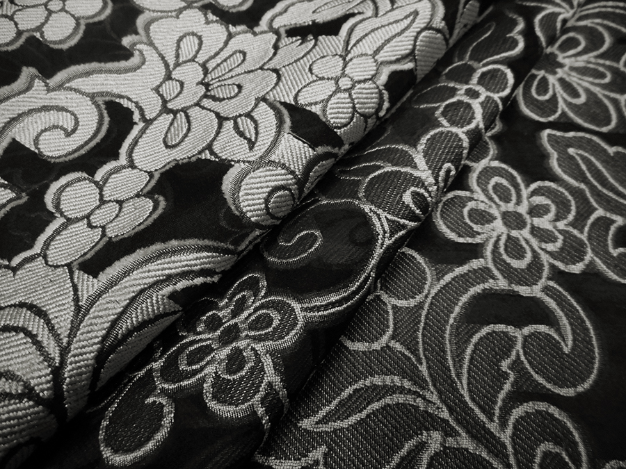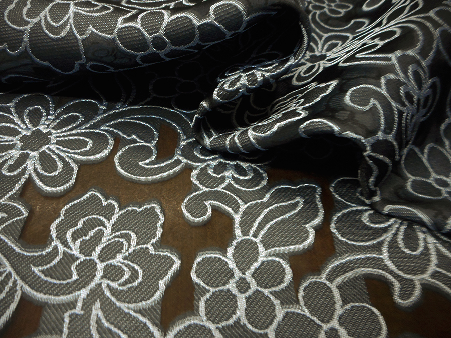 PREGIATA ED ESCLUSIVA ORGANZA , FONDO NERO CON FIORI A LAVORAZIONE DEVORE’ FIL COUPE’ GRIGIO PERLA . INDICATO PER: CAMICIE, CASACCHE, ABITI, GONNE, ECC..